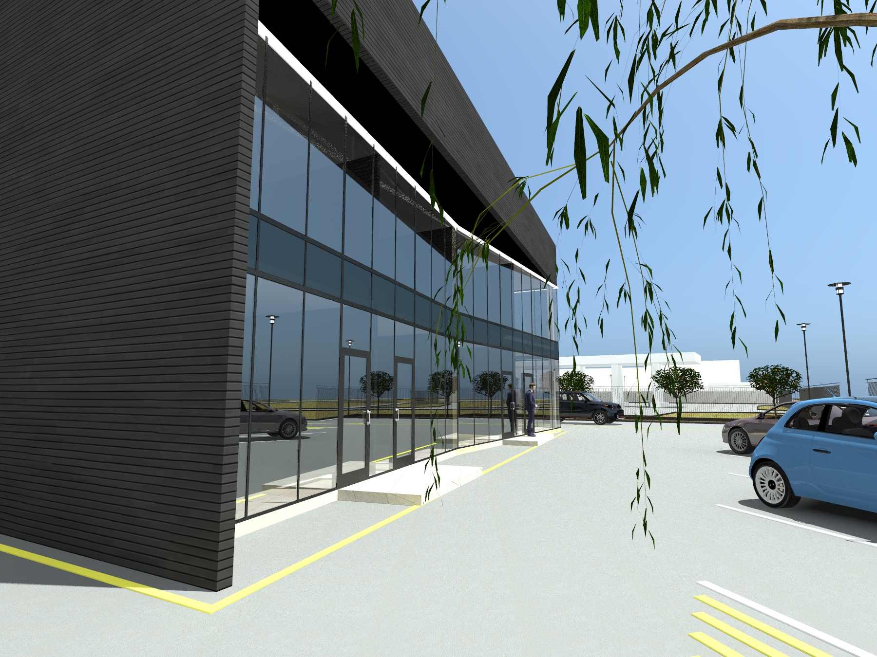 Часть фасада здания, а конкретно административно-бытовой комплекс композиционно обращен