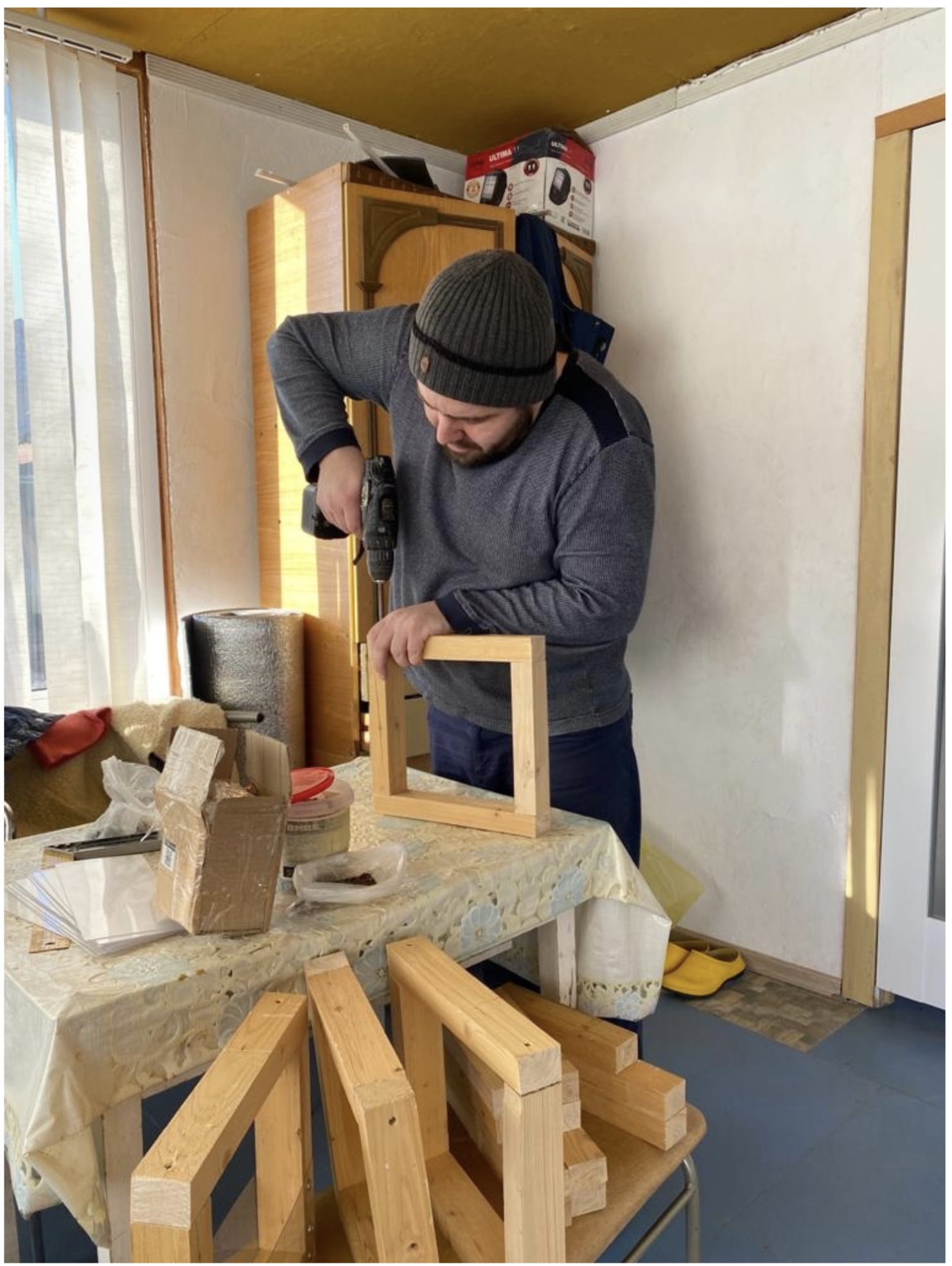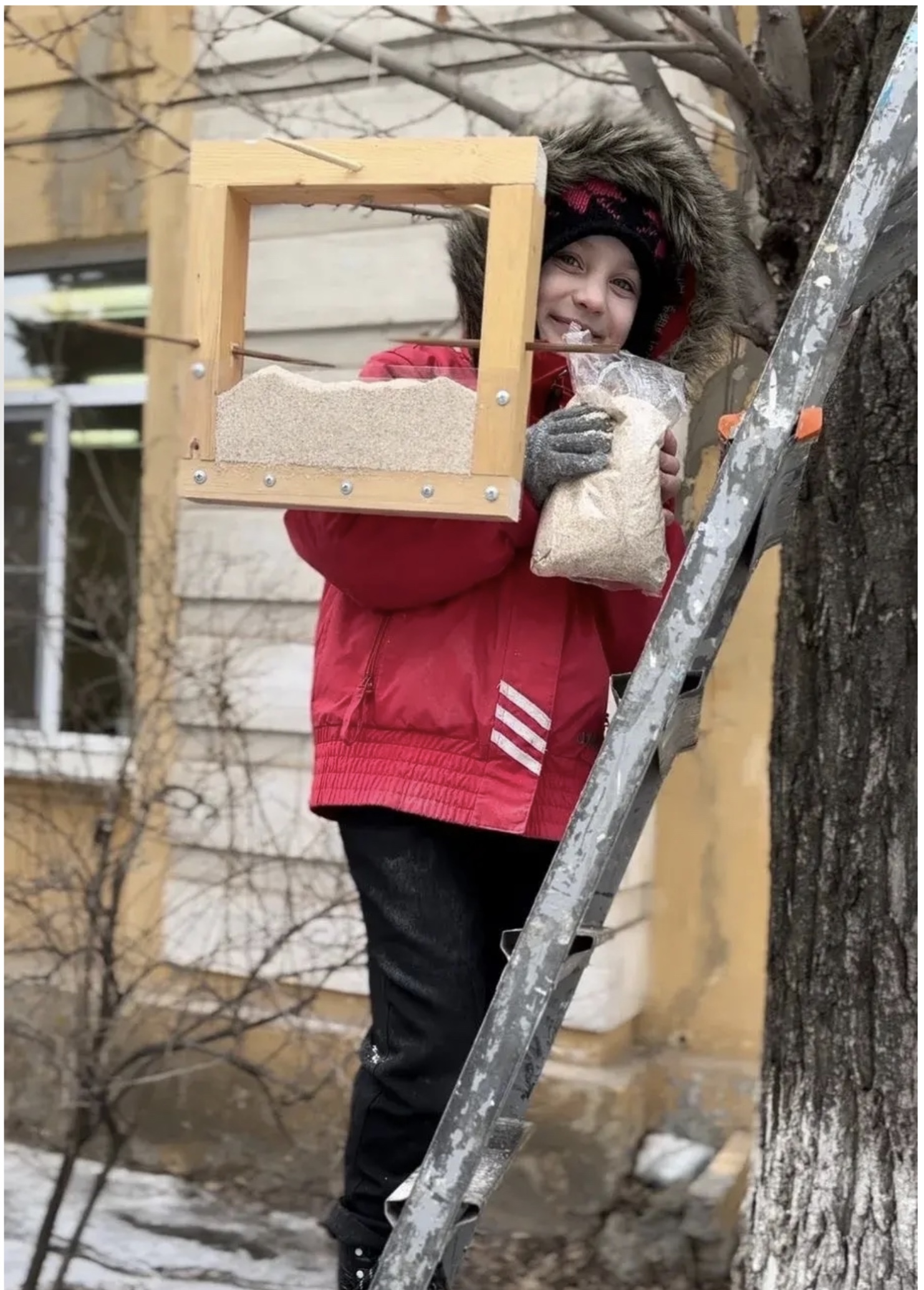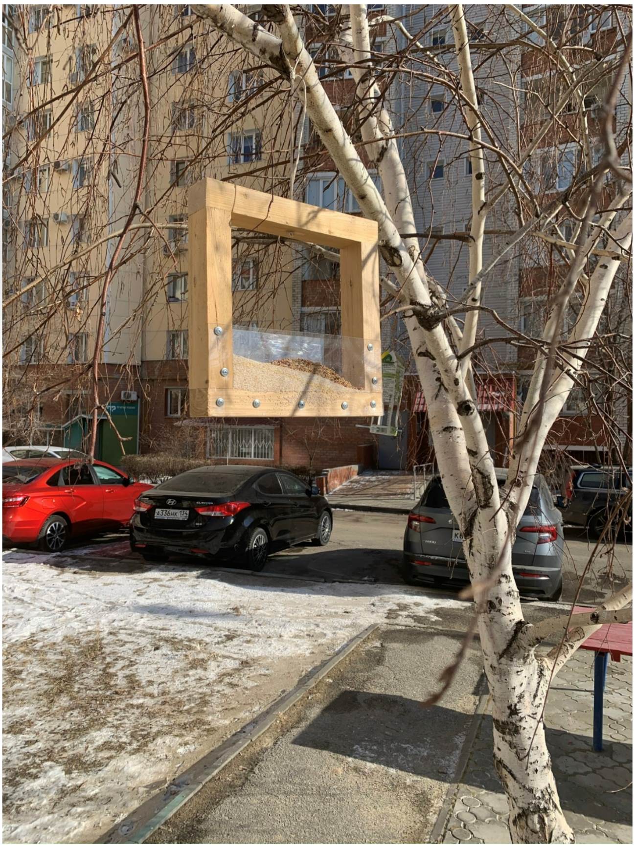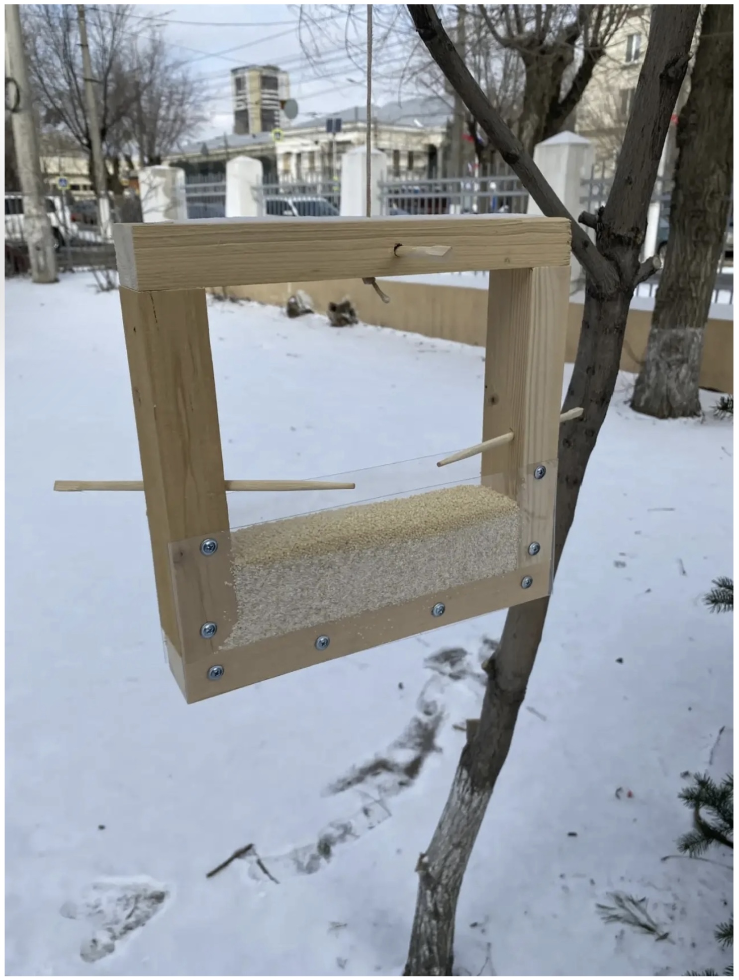 Экологическая акция «Покормите птиц» стала доброй традицией для многих школ, садов, дворов и двориков нашего города. Мы не стали исключением. В 2023 году вместе с помощниками изготовили семь оригинальных кормушек. Подвесили их в разных доступных местах. В том числе и у себя дома, за окном. Фотографии достойной под рукой не нашлось, зато есть картина.Много времени птицы не принимали данный объект. Попривыкнув, стали посещать регулярно, несмотря на легкость и незамысловатость конструкции, птицы умудряются и кормиться, и ютиться в этих кормушках как в домиках…